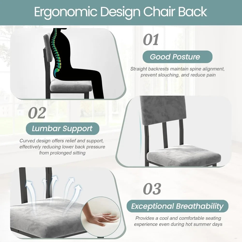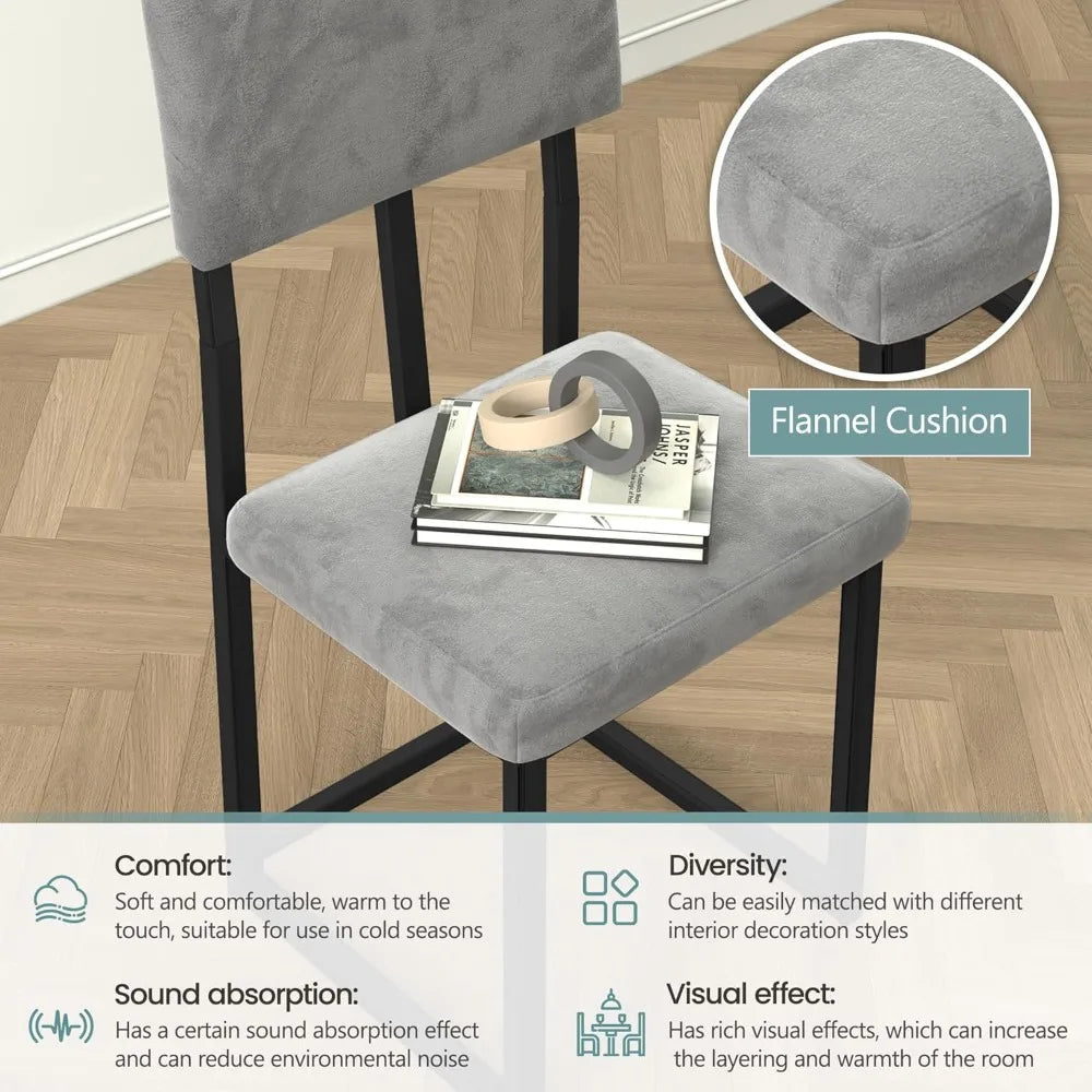 - Plush velvet chairs feature high-density foam for a soft, supportive seat, plus breathable gray fabric that stays comfortable through long meals.