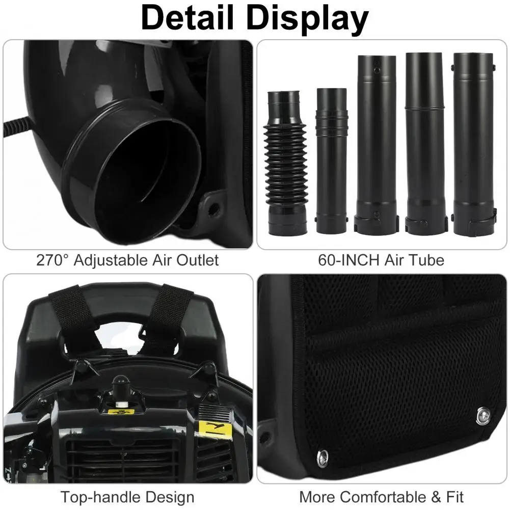 - Versatile for leaves, dust, and seasonal debris; includes five outlet pipes, toolkit, oil bottle, funnel, user manual, and extra straps.