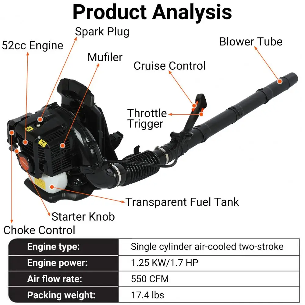 - 550 CFM air volume from a 52cc 2-stroke engine (1.7HP) delivers rapid clearing for lawns, sidewalks, and driveways, expansive properties included.