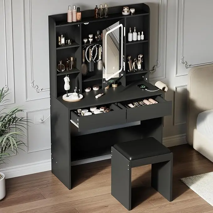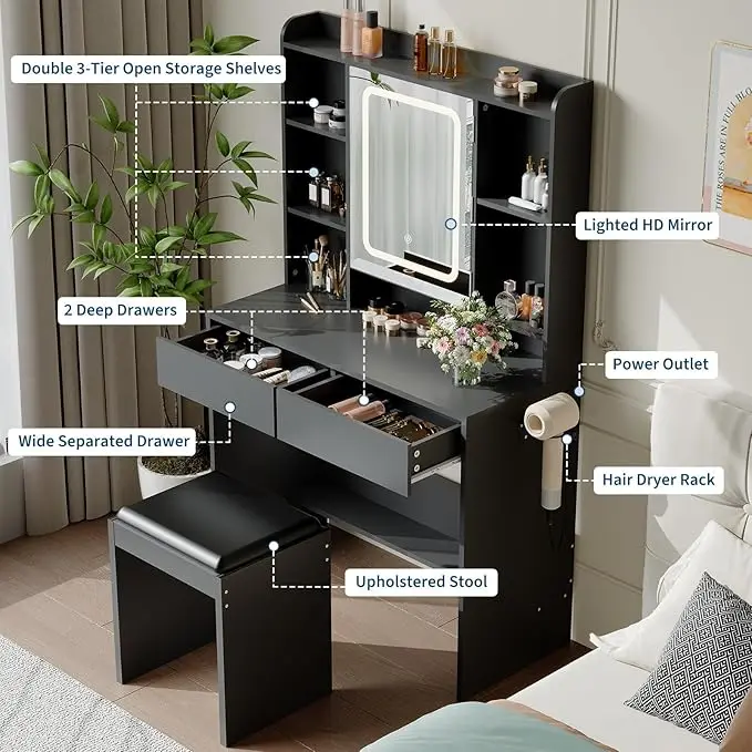 Elevate your daily routine with the HiMISS Vanity Desk With Mirror And Adjustable Lights, a compact dressing station crafted for focused grooming and self-care.