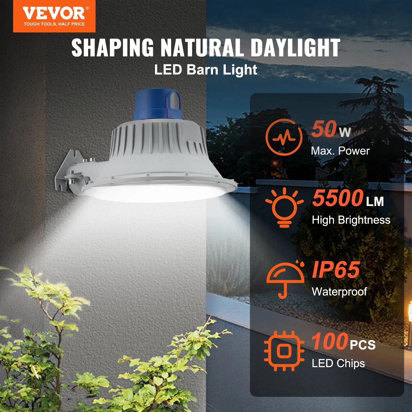 VEVOR LED Barn Light 50W 5500LM / 100W 11000LM Ultra Brightness 6000K Daylight Security Flood Lighting for Outside Yard, Street